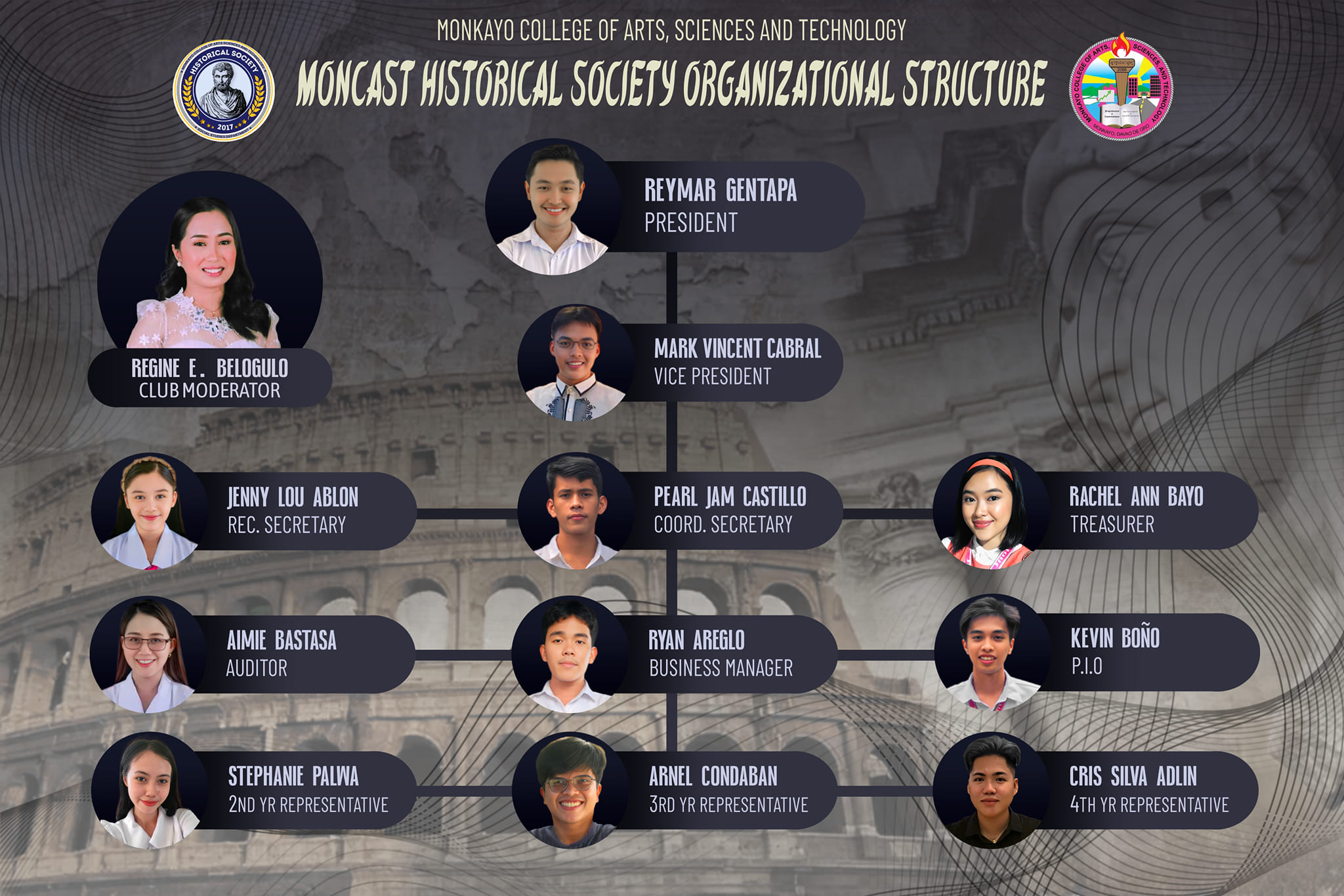 Meet the organizational structure of the Moncast Historical Society's new set of officers for the Academic Year 2024-2025. Join us in this new academic year as we embrace the competitive spirit and passion for teaching.